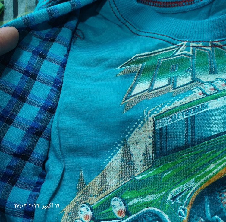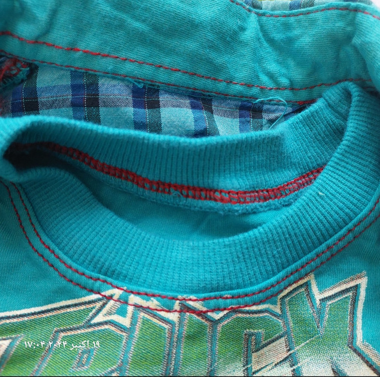 جلوی تیشرت به عنوان زیره پیراهن از طرف درز پهلو به پیراهن وصل شده ولی سرشانه و یقه تیشرت جدا از پیراهنه و آستین هم ترکیبی کار شده