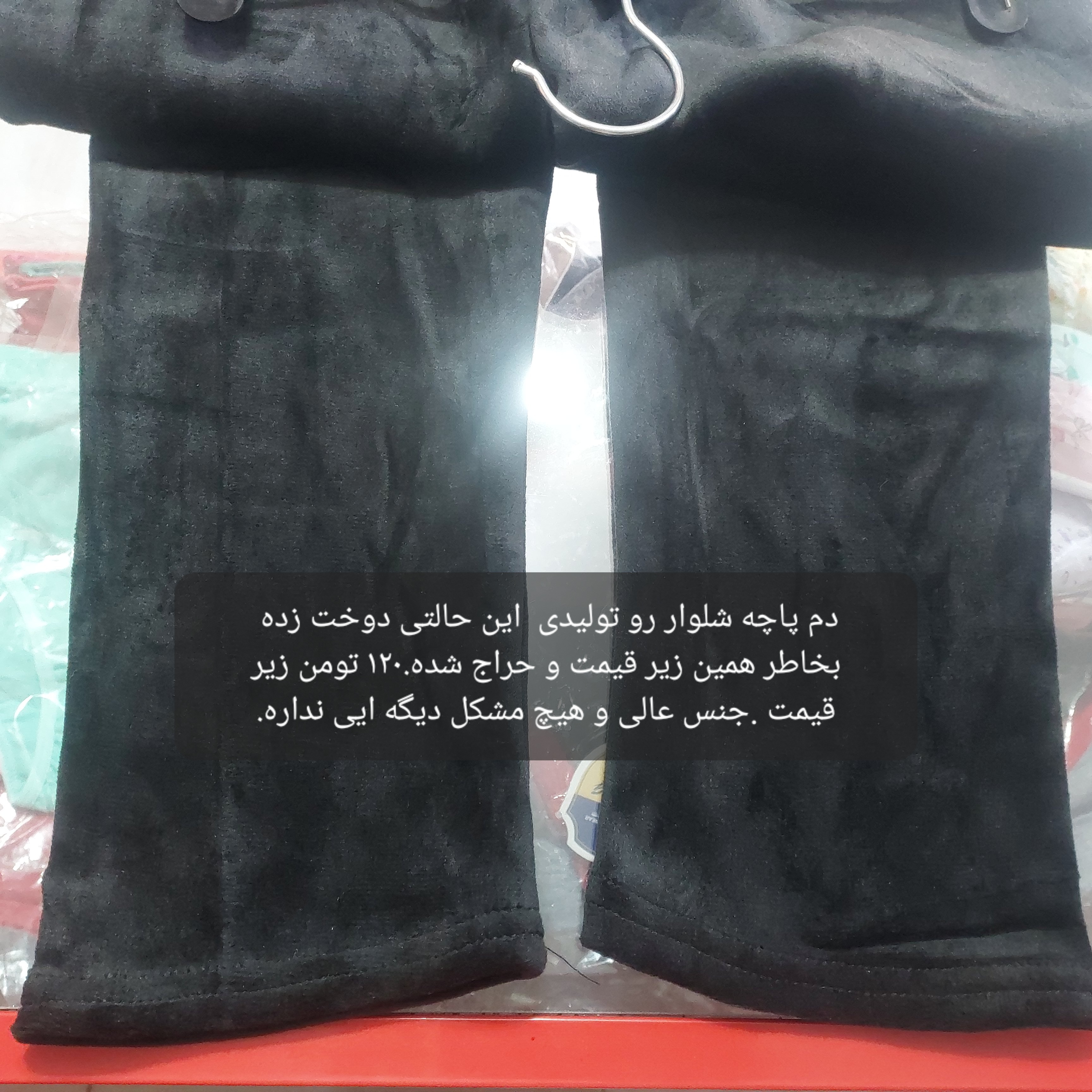دم پاچه شلوار بد برش زده و بد دوخت شده که عکس و توضیحشو گذاشتم و هیچ عیب دیگه ایی نداره.و اگه حساس نباشید همین جور هم میشه استفاده کرد. که۱۲۰ تومن زیر قیمت گذاشته شده